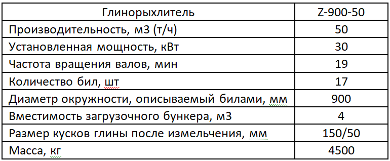 Глинорыхлитель Z-900-50, предназначен для измельчения крупных и мерзлых комьев глины с пределом прочности кусков на сжатие не более 1,7 Мпа и размером не более 1000 мм. Устанавливается в технологических линиях по производству бентонита и строительной керамики. Конструкция и компоновка сборочных единиц и механизмов глинорыхлителя обеспечивает удобный и безопасный доступ при ремонте, техническом обслуживании и монтаже.